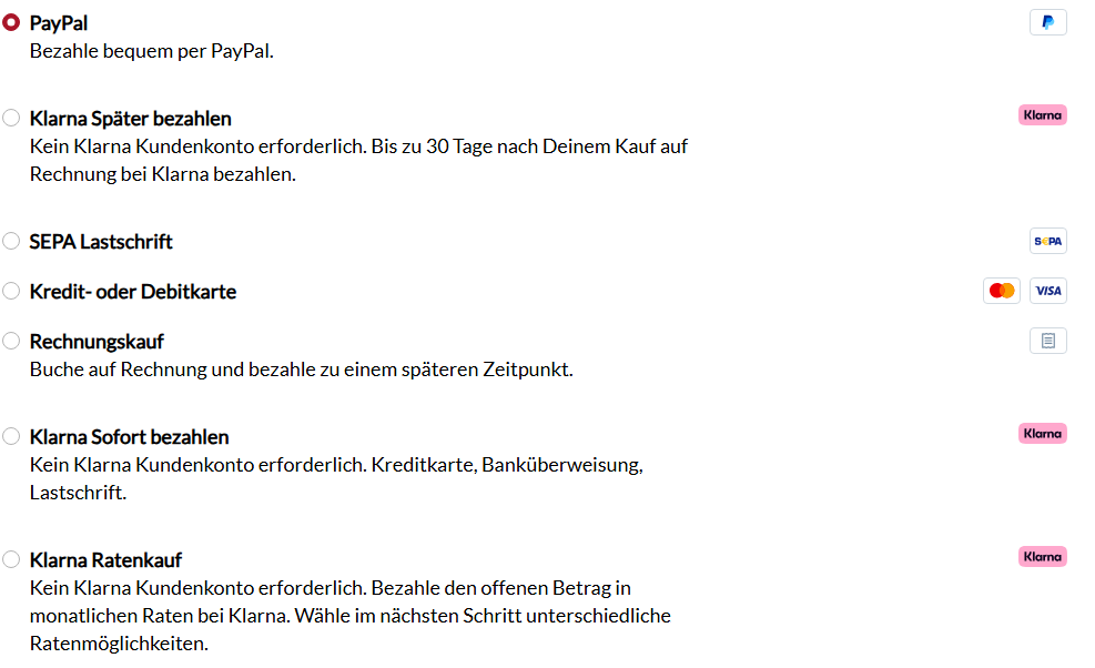PayPal, Später bezahlen (über Klarna), Sofort bezahlen (über Klarna), Ratenkauf (über Klarna), Rechnungskauf, SEPA-Lastschrift, Kredit- oder Debitkarte.