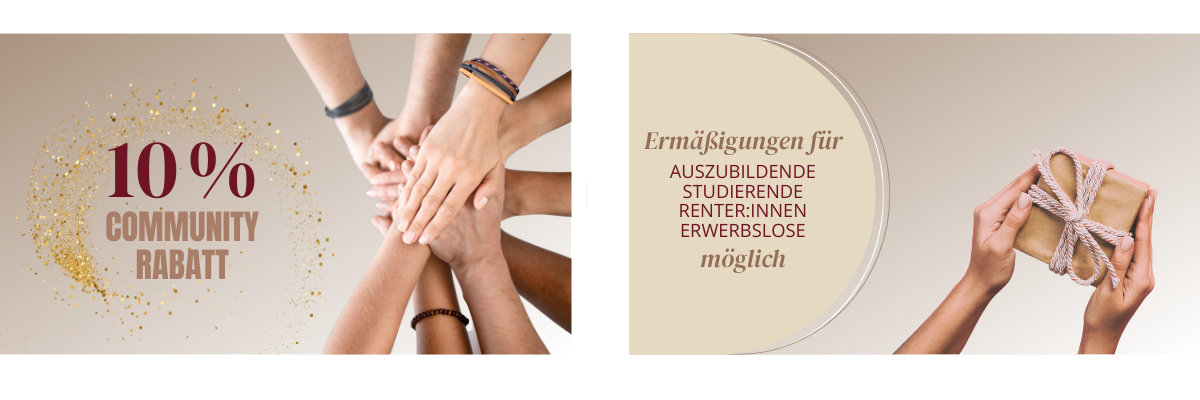 Für Auszubildende, Studierende, Rentner:innen sowie Erwerbslose ist eine Gebührenermäßigung in Höhe von 100 EUR für die Präsenz-Seminare möglich. Sollte einer der genannten Punkte auf Dich zutreffen, schicke uns einfach vor einer eventuellen Anmeldung eine Kopie Deiner entsprechenden Unterlagen (z. B. Studien- oder Ausbildungsausweis) im Anhang per E-Mail an mail@mariasanchez.de mit (Montag bis Feitag bis 17:00 Uhr), damit wir Dir einen Gutschein-Code erstellen können.