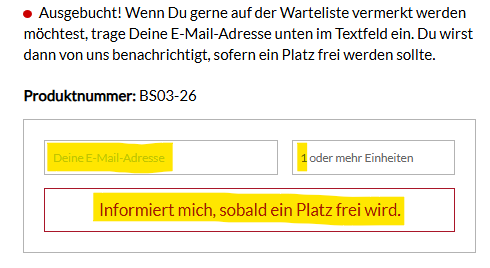 „Grundwissen I“, „Grundwissen II“, „Verkörpern + Bewusstseinsschulung“ und „Kanalübung II“Um Dich bei einem bereits ausgebuchten Seminar auf die Warteliste setzen zu lassen, klicke zunächst bei dem jeweiligen Seminar auf die rote Schaltfläche „Ausgebucht“. Dadurch öffnet sich die Produkt-Infoseite des Seminars und dort kannst Du Dich (wie auf dem Bild unten gezeigt) mit Deiner E-Mail-Adresse eigenständig auf der Warteliste eintragen.