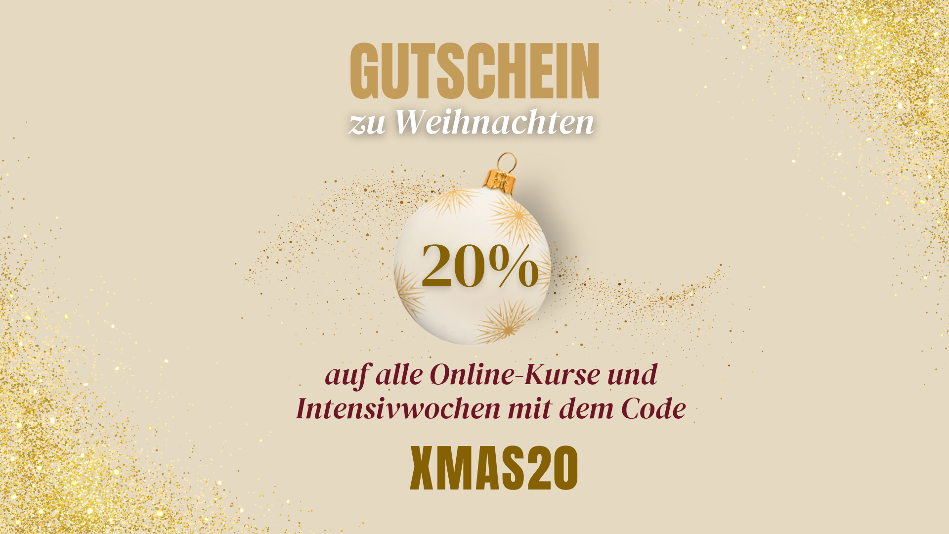 Wenn Du dieses Angebot wahrnehmen möchtest, lege den von Dir gewünschten Online-Kurs oder die jeweilige Online-Intensivwoche in den Warenkorb, gib bei der Buchung den Gutscheincode XMAS20 ein und bestätige ihn über das kleine Häkchen direkt neben dem Eingabefeld.✅